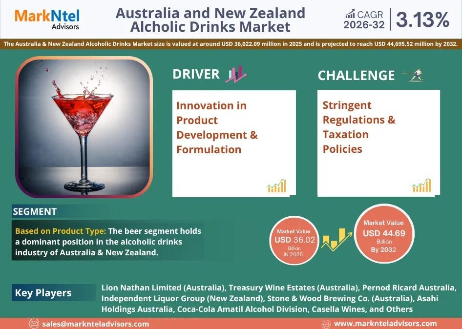 As per recent study by Markntel Advisors The Australia & New Zealand Alcoholic Drinks Market size is valued at around USD 36,022.09 million in 2025 and is projected to reach USD 44,695.52 million by 2032. Along with this, the market is estimated to grow at a CAGR of around 3.13% during the forecast period, i.e., 2026-32.