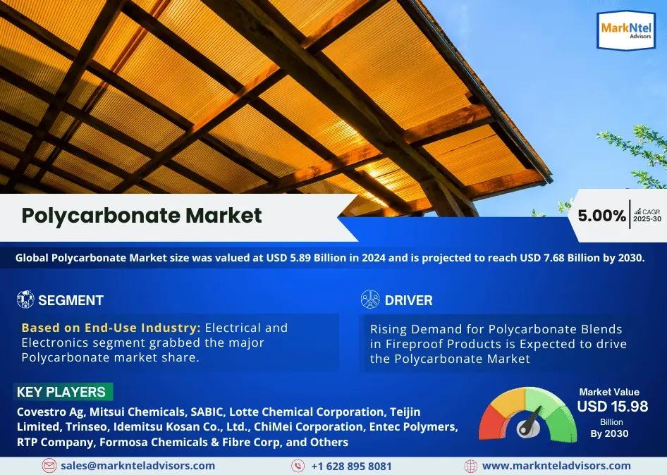 As per recent study by Markntel Advisors The Global Polycarbonate Market size was valued at USD 5.89 Billion in 2024 and is projected to reach USD 7.68 Billion by 2030. Along with this, the market is estimated to grow at a CAGR of around 5.00% during the forecast period, i.e., 2025-30.