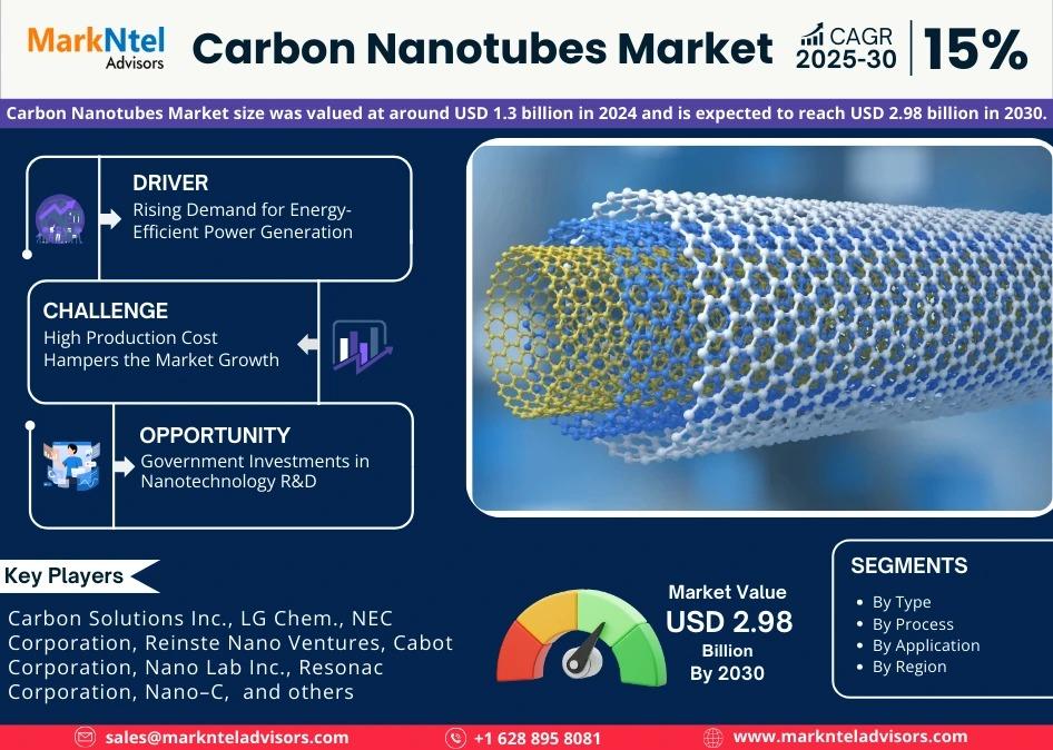 As per recent study by Markntel Advisors The Global Carbon Nanotubes Market size was valued at around USD1.3 billion in 2024 and is expected to reach USD2.98 billion in 2030. Along with this, the market is estimated to grow at a CAGR of around 15% during the forecast period, i.e., 2025-30.
