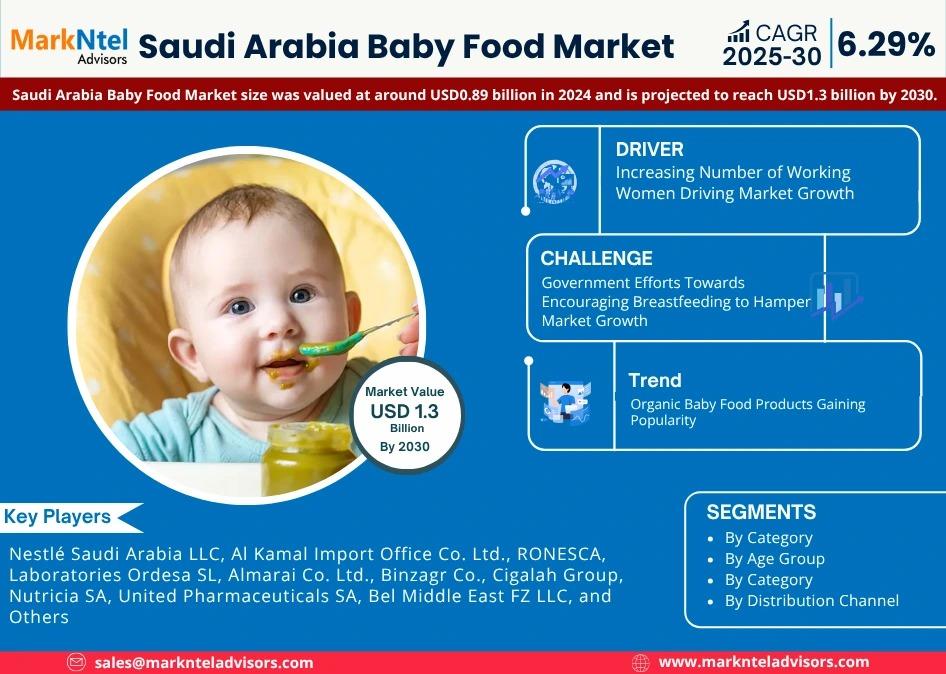 As per recent study by Markntel Advisors The Saudi Arabia Baby Food Market size was valued at around USD0.89 billion in 2024 and is projected to reach USD1.3 billion by 2030. Along with this, the market is estimated to grow at a CAGR of around 6.29% during the forecast period, i.e., 2025-30.