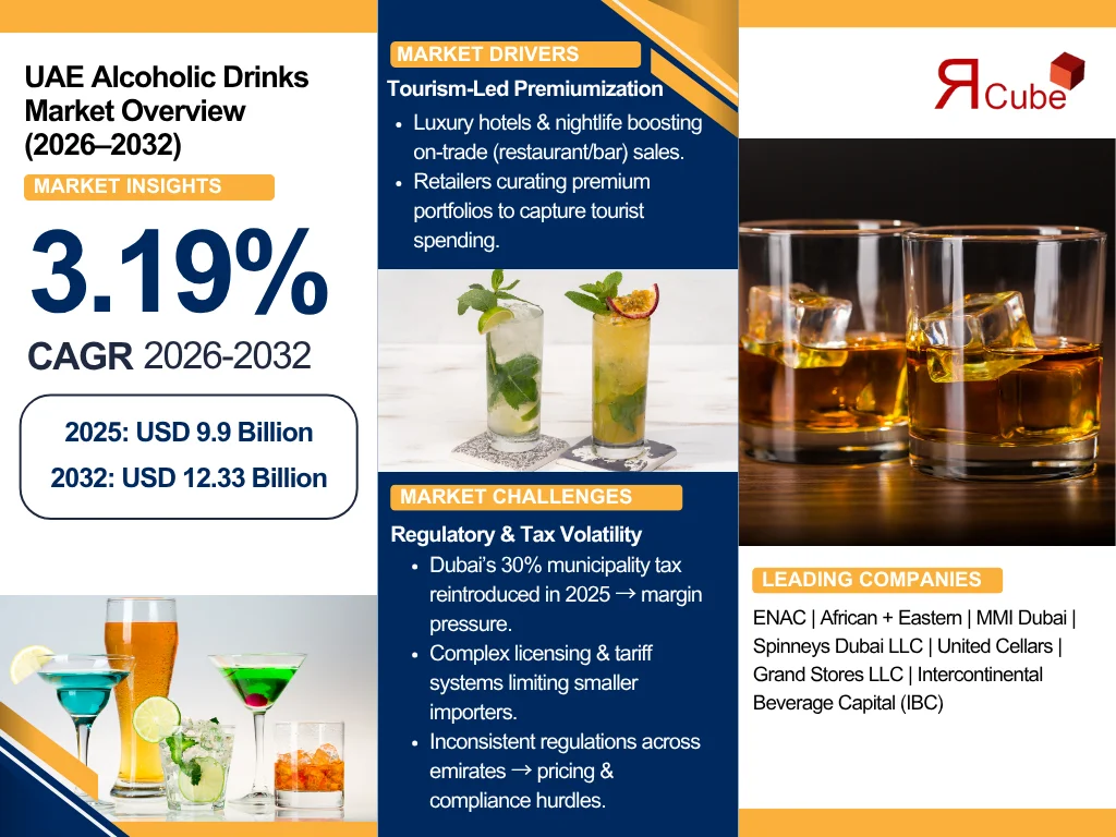 According to the latest report by The Reports Cube insights the The UAE Alcoholic Drinks Market is anticipated to register a CAGR of around 3.19% during the forecast period, 2026-32. Additionally, the market size was valued at nearly USD 9.9 billion in 2025 and is projected to reach nearly USD 12.33 billion by 2032.