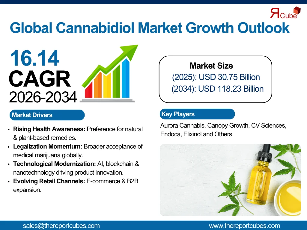 According to the latest report by The Reports Cube insights The Cannabidiol Market is anticipated to register a CAGR of around 16.14% during the forecast period, 2026-34. Additionally, the market size was valued at nearly USD 30.75 billion in 2025 and is projected to reach nearly USD 118.23 billion by 2034.