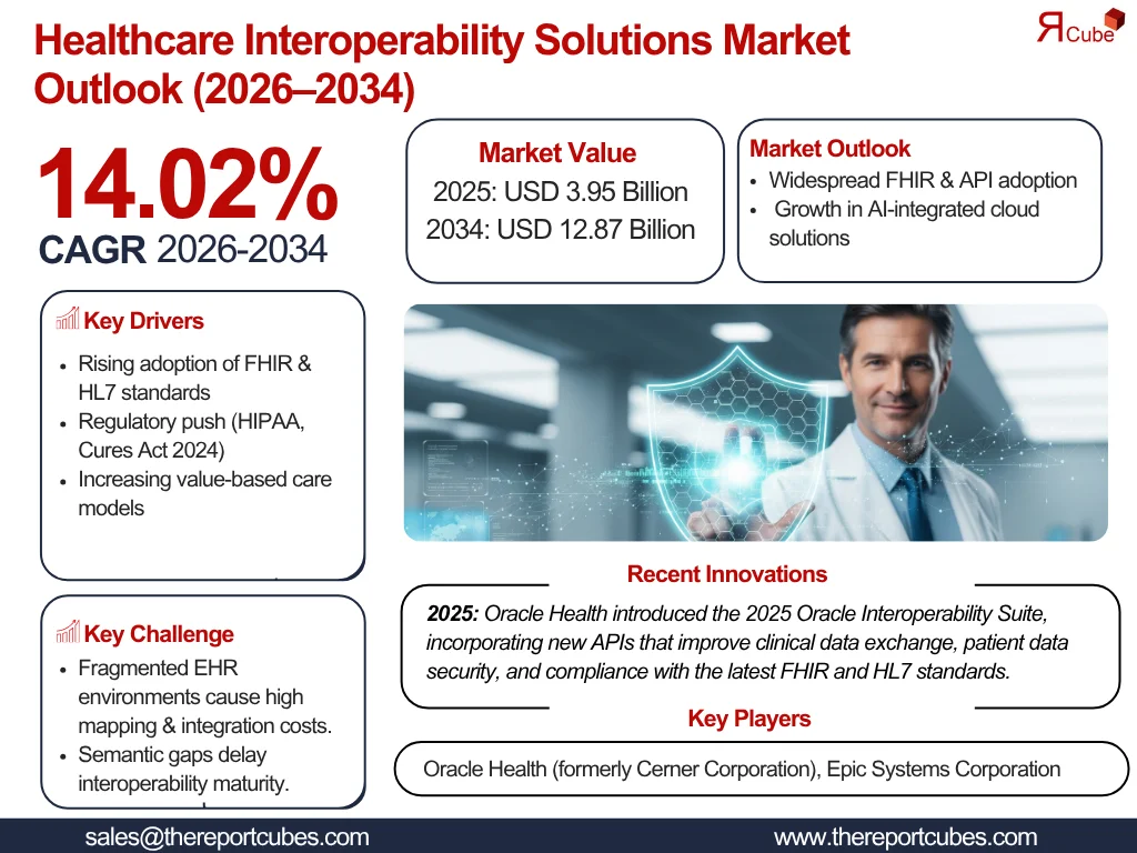 According to the latest report by The Reports Cube insights The Healthcare Interoperability Solutions Market is anticipated to register a CAGR of around 14.02% during the forecast period, 2026-34. Additionally, the market size was valued at nearly USD 3.95 billion in 2025 and is projected to reach almost USD 12.87 billion by 2034.