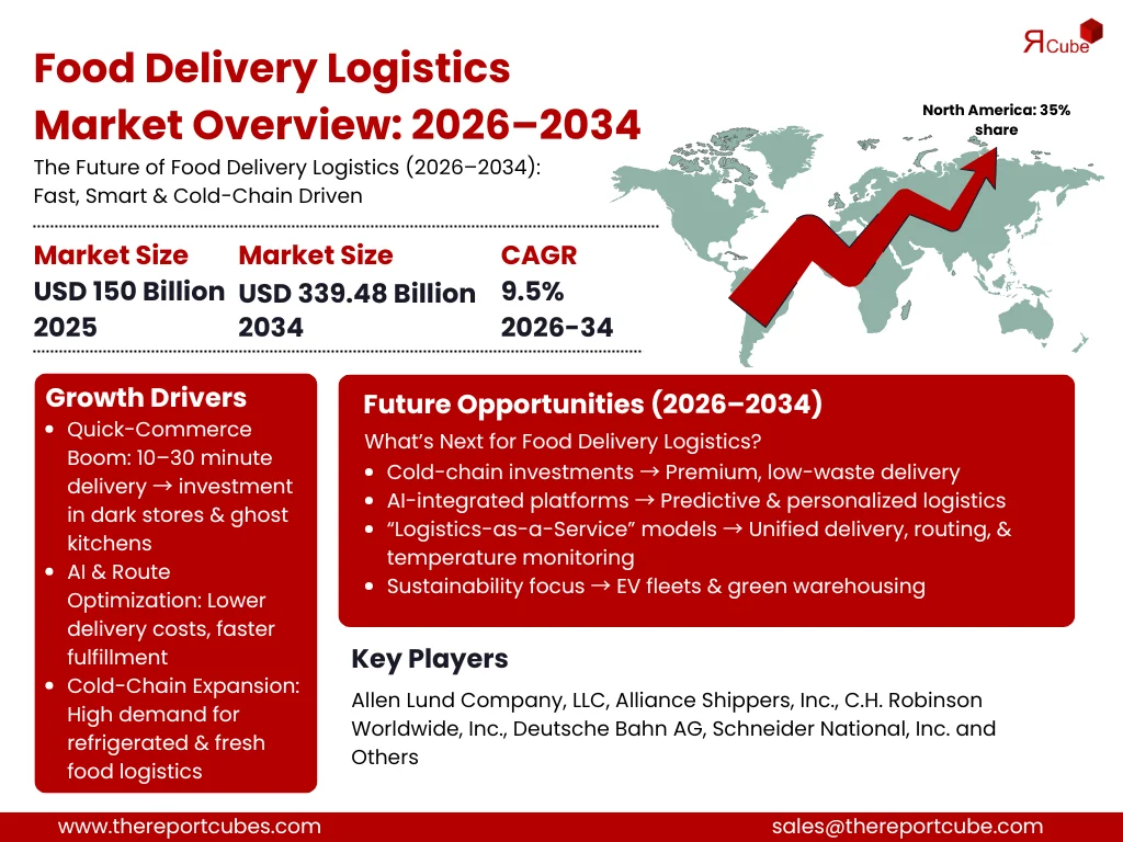 According to the latest report by The Reports Cube insights The Food Delivery Logistics Market is anticipated to register a CAGR of around 9.5% during the forecast period, 2026-34. Additionally, the market size was valued at nearly USD 150 billion in 2025 and is projected to reach almost USD 339.48 billion by 2034.