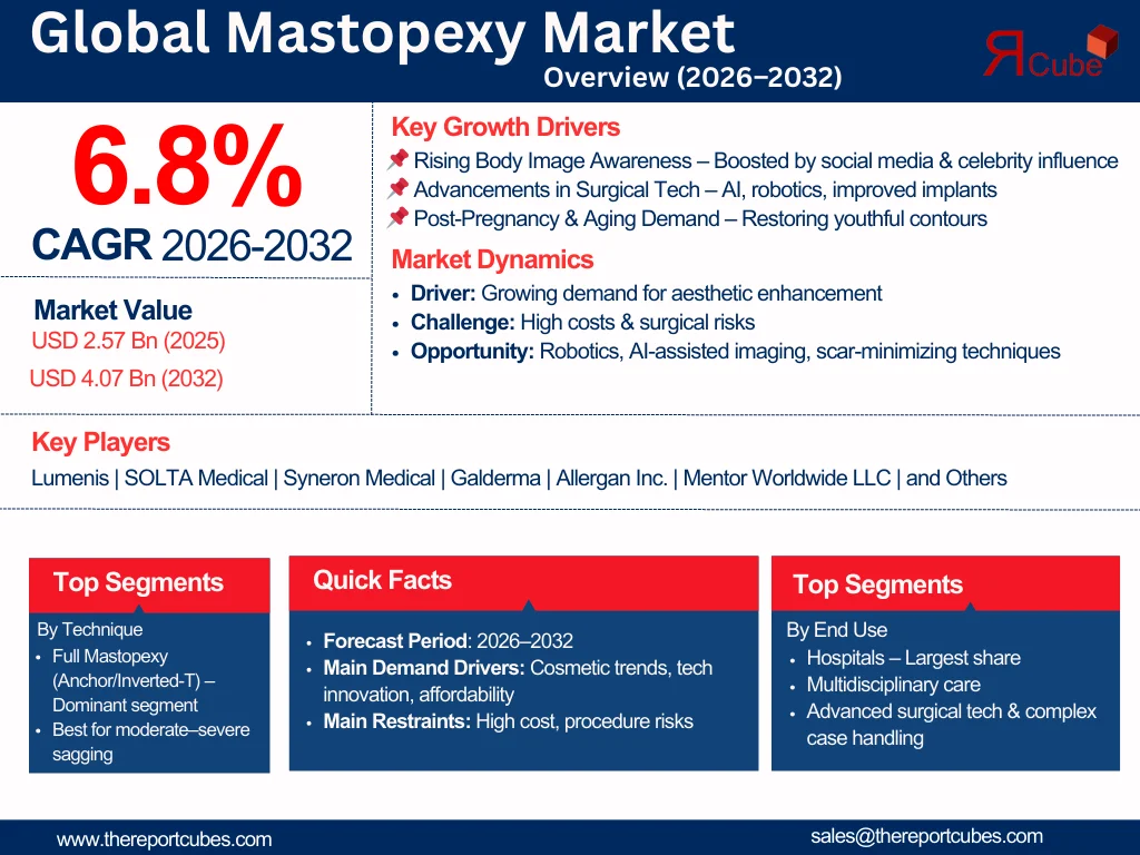 According to the latest report by The Reports Cube insights The Global Mastopexy Market is anticipated to register a CAGR of around 6.8% during the forecast period, 2026-32. Also, the market size was valued at nearly USD 2.57 billion in 2025 and is foreseen to witness nearly USD 4.07 billion during 2032. The aspects prompting growth include surging demand for cosmetics & aesthetic procedures, instigated by increasing body image consciousness, social media encouragement, and enhanced affordability.
