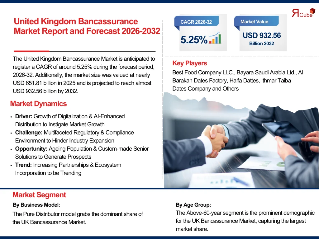 According to the latest report by The Reports Cube insights The United Kingdom Bancassurance Market is anticipated to register a CAGR of around 5.25% during the forecast period, 2026-32. Additionally, the market size was valued at nearly USD 651.81 billion in 2025 and is projected to reach almost USD 932.56 billion by 2032. The expansion of the industry is being driven by multiple interlinked aspects, particularly the surging digitalization of banking & insurance services, demographic changes, and developing consumer preferences.