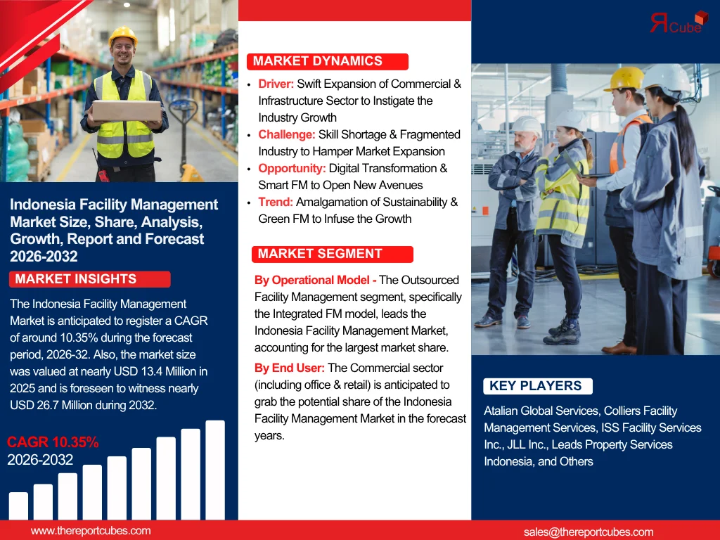 According to the latest report by The Report Cube, study Indonesia Facility Management Market is anticipated to register a CAGR of around 10.35% during the forecast period, 2026-32. Also, the market size is valued at nearly USD 13.4 Million in 2025 and is foreseen to witness nearly USD 26.7 Million during 2032. This market progression is instigated by increasing commercial infrastructure, swift urbanization, and growing acceptance of outsourced facility management solutions.