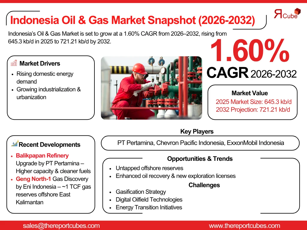 According to the latest report by The Report Cube, study Indonesia Oil & Gas Market is expected to register a CAGR of around 1.60% during the forecast period 2026–2032. In 2025, the market size is valued at approximately 645.3 thousand barrels per day, and it is projected to reach nearly 721.21 thousand barrels per day by 2032. The country remains an essential energy player across Southeast Asia, supported by its significant hydrocarbon reserves, increasing domestic energy demand, and government reforms focused on advancing upstream & downstream activities. Also, being one of the leading developing economies, the nation plays a trivial role in regional energy security.