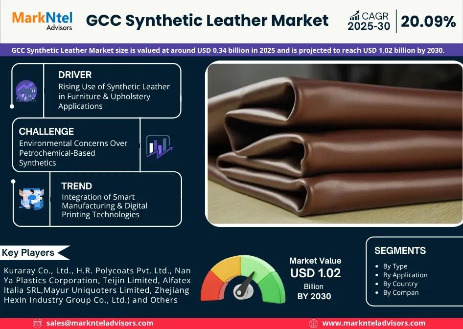 As per recent study by MarkNtel Advisors The GCC Synthetic Leather Market size is valued at around USD 0.34 billion in 2025 and is projected to reach USD 1.02 billion by 2030. Along with this, the market is estimated to grow at a CAGR of around 20.09% during the forecast period, i.e., 2025-30.