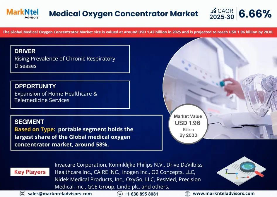 As per recent study by MarkNtel Advisors The Global Medical Oxygen Concentrator Market size is valued at around USD 1.42 billion in 2025 and is projected to reach USD 1.96 billion by 2030. Along with this, the market is estimated to grow at a CAGR of around 6.66% during the forecast period, i.e., 2025-30.