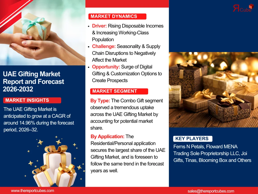 According to the latest report by The Report Cube, study UAE Gifting Market is anticipated to grow at a CAGR of around 14.96% during the forecast period, 2026–32. The industry is predicted to expand owing to a combination of socio-economic & cultural factors. The increasing disposable income of residents, an expanding working-class population across the nation, and the rising trend of celebrating occasions like birthdays, anniversaries, corporate events, and religious festivals have considerably elevated market demand for different giving options.