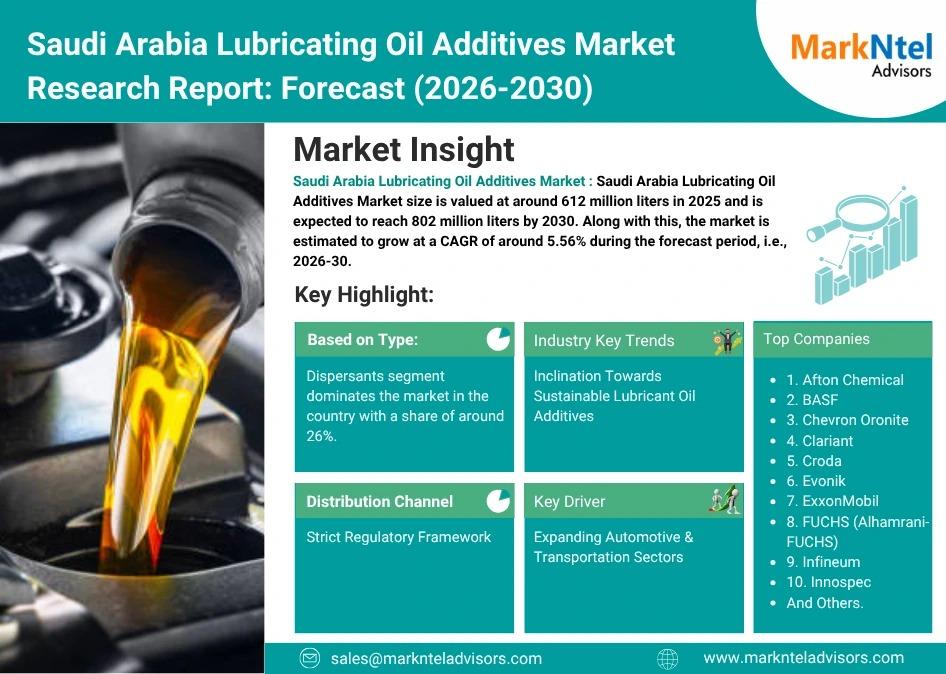 As per recent study by MarkNtel Advisors The Saudi Arabia Lubricating Oil Additives Market size is valued at around 612 million liters in 2025 and is expected to reach 802 million liters by 2030. Along with this, the market is estimated to grow at a CAGR of around 5.56% during the forecast period, i.e., 2026-30.