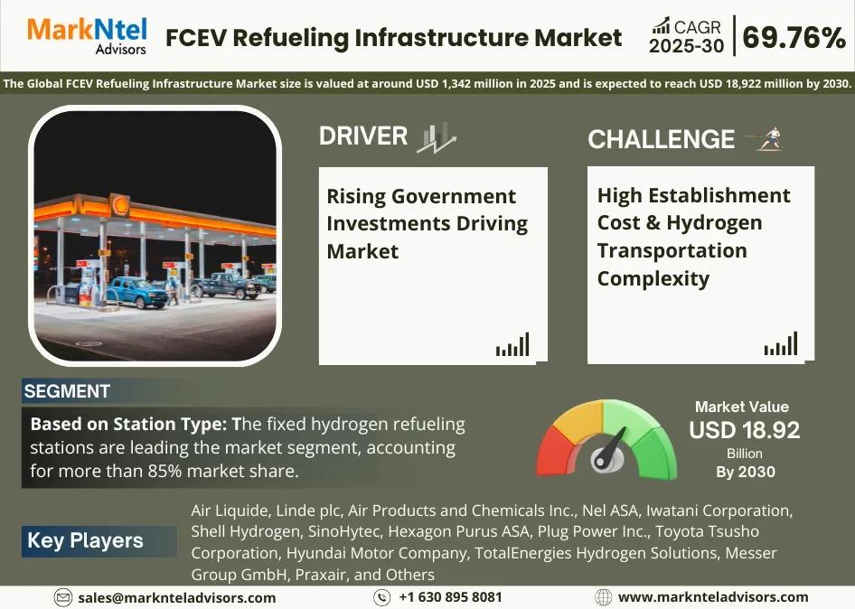 As per recent study by MarkNtel Advisors The Global FCEV Refueling Infrastructure Market size is valued at around USD 1,342 million in 2025 and is expected to reach USD 18,922 million by 2030. Along with this, the market is estimated to grow at a CAGR of around 69.76% during the forecast period, i.e., 2026-30.