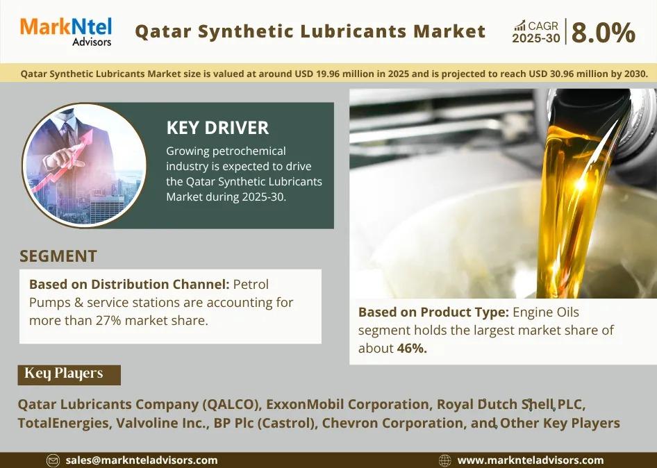 As per recent study by MarkNtel Advisors The Qatar Synthetic Lubricants Market size is valued at around USD 19.96 million in 2025 and is projected to reach USD 30.96 million by 2030. Along with this, the market is estimated to grow at a CAGR of around 8% during the forecast period, i.e., 2025-30.