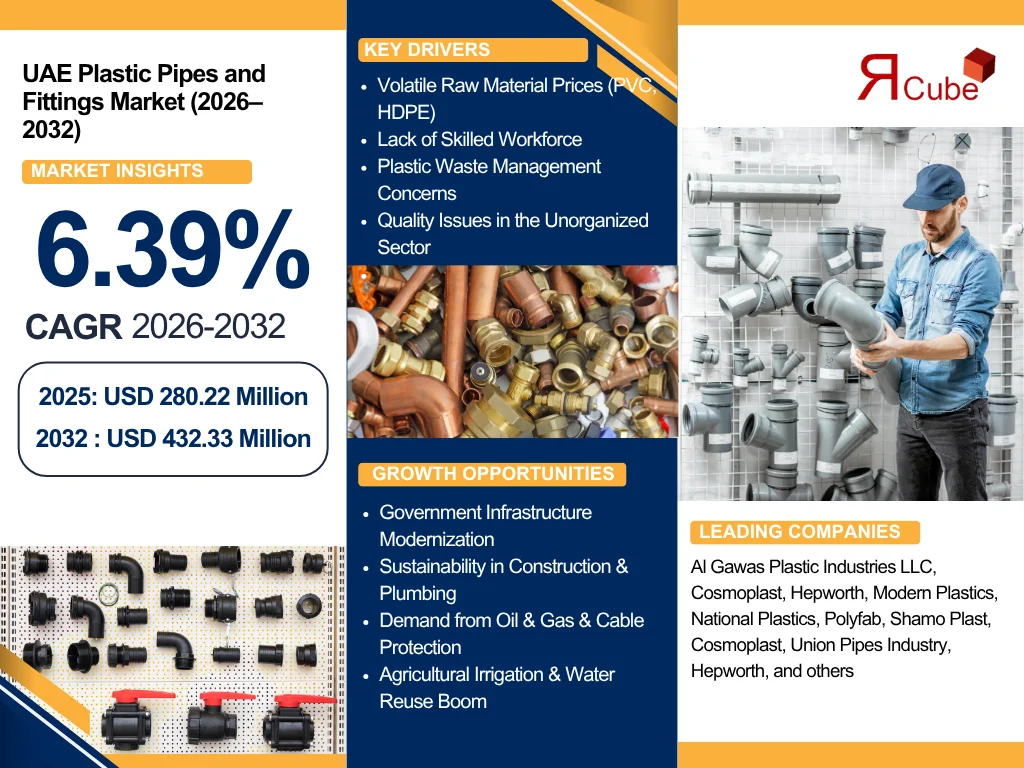 According to the latest report by The Report Cube, study UAE Plastic Pipes and Fittings Market is anticipated to register a CAGR of around 6.39% during the forecast period, 2026–2032. The market size is valued at nearly USD 280.22 Million in 2025 and is expected to reach approximately USD 432.33 Million by 2032. The industry is poised for notable expansion, driven primarily by the country’s accelerating infrastructure and urban development agenda. As large-scale projects continue to shape the residential, commercial, and industrial landscapes, the demand for durable and efficient piping systems has significantly increased in the growing market. Moreover, the government’s sustained investments in water distribution, sewage management, and district cooling networks are creating a favorable environment for pipe and fitting manufacturers, further scaling the Plastic pipes and fittings market in UAE.
