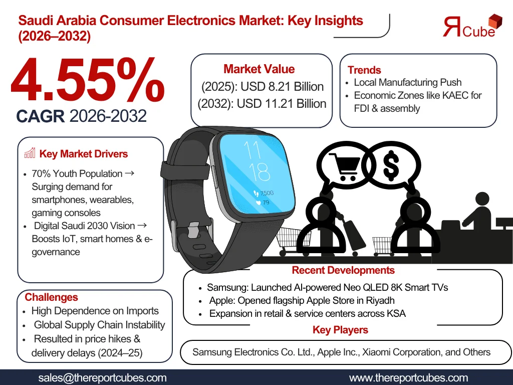 According to the latest report by The Report Cube, study Saudi Arabia Consumer Electronics Market is anticipated to register a CAGR of around 4.55% during the forecast period 2026–2032. The market was valued at nearly USD 8.21 billion in 2025 and is projected to reach approximately USD 11.21 billion by 2032. Rapid urbanization, growing disposable incomes, increased digital literacy, and the government's drive for digitization under Saudi Vision 2030 have all combined to create a promising environment for the customer electronics sector in Saudi Arabia.