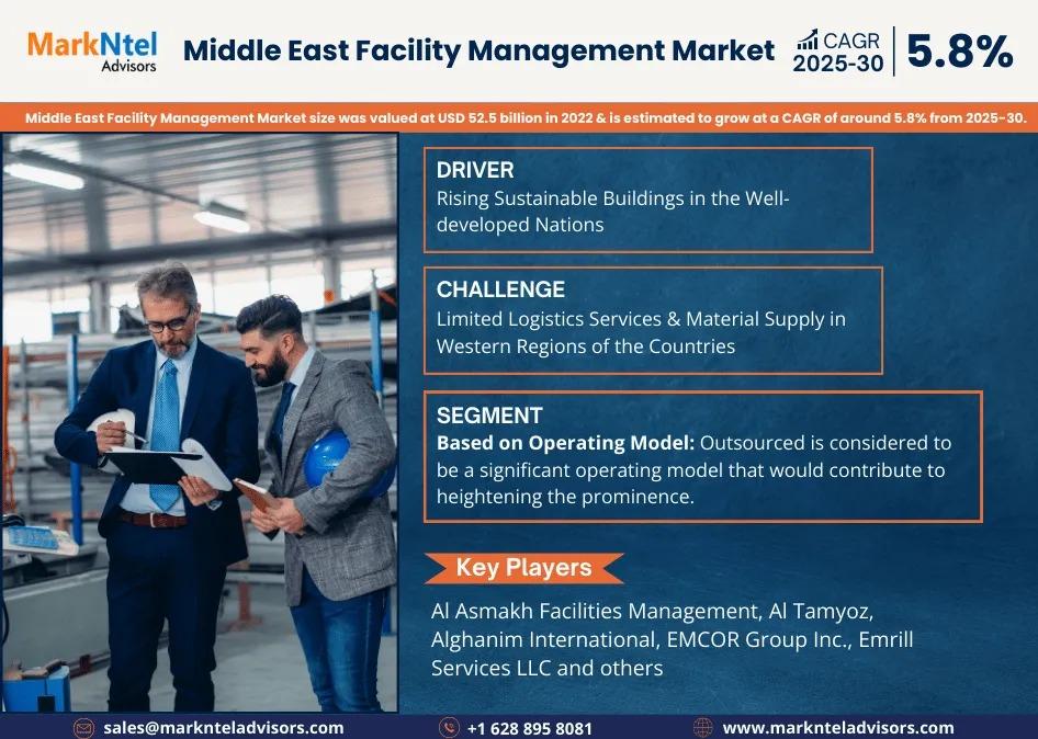 MarkNtel Advisors, a leading market research and consulting firm, has announced the release of its latest study titled Middle East Facility Management Market Research Report: Forecast (2025–2030). This report provides a detailed assessment of the Middle East Facility Management, covering its evolving dynamics, emerging trends, key growth drivers, major challenges, and competitive landscape.