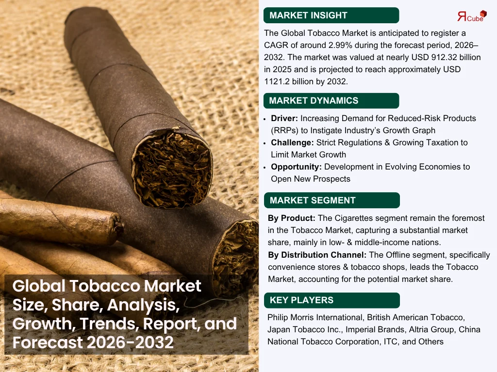 According to the latest report by The Report Cube, study Tobacco Market is anticipated to register a CAGR of around 2.99% during the forecast period, 2026–2032. The market was valued at nearly USD 912.32 billion in 2025 and is projected to reach approximately USD 1121.2 billion by 2032. The market expansion is compelled by the constant global demand for tobacco-based products, the launch of Next Generation Products (NGPs), like e-cigarettes & heated tobacco, and the growth of online retail channels. Also, the industry encompasses a broad range of items, such as cigars, smokeless tobacco, cigarettes, and novel nicotine substitutes, each catering to varied regional ingesting patterns.
