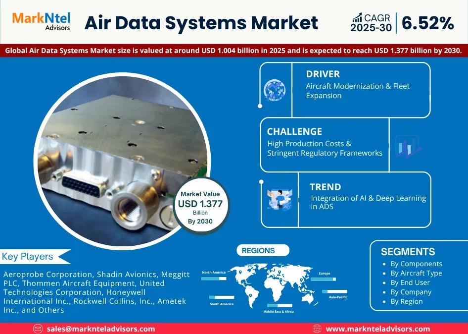 As per recent study by MarkNtel Advisors The Global Air Data Systems Market size is valued at around USD 1.004 billion in 2025 and is expected to reach USD 1.377 billion by 2030. Along with this, the market is estimated to grow at a CAGR of around 6.52% during the forecast period, i.e., 2025-30.