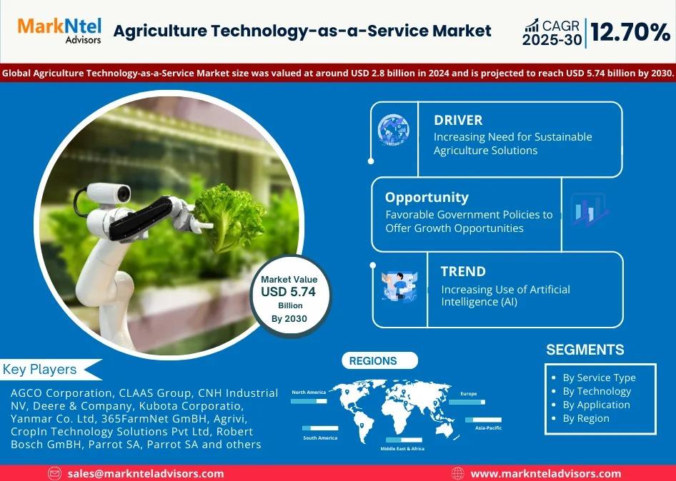 As per recent study by MarkNtel Advisors The Global Agriculture Technology-as-a-Service Market size was valued at around USD 2.8 billion in 2024 and is projected to reach USD 5.74 billion by 2030. Along with this, the market is estimated to grow at a CAGR of around 12.70% during the forecast period, i.e., 2025-30.