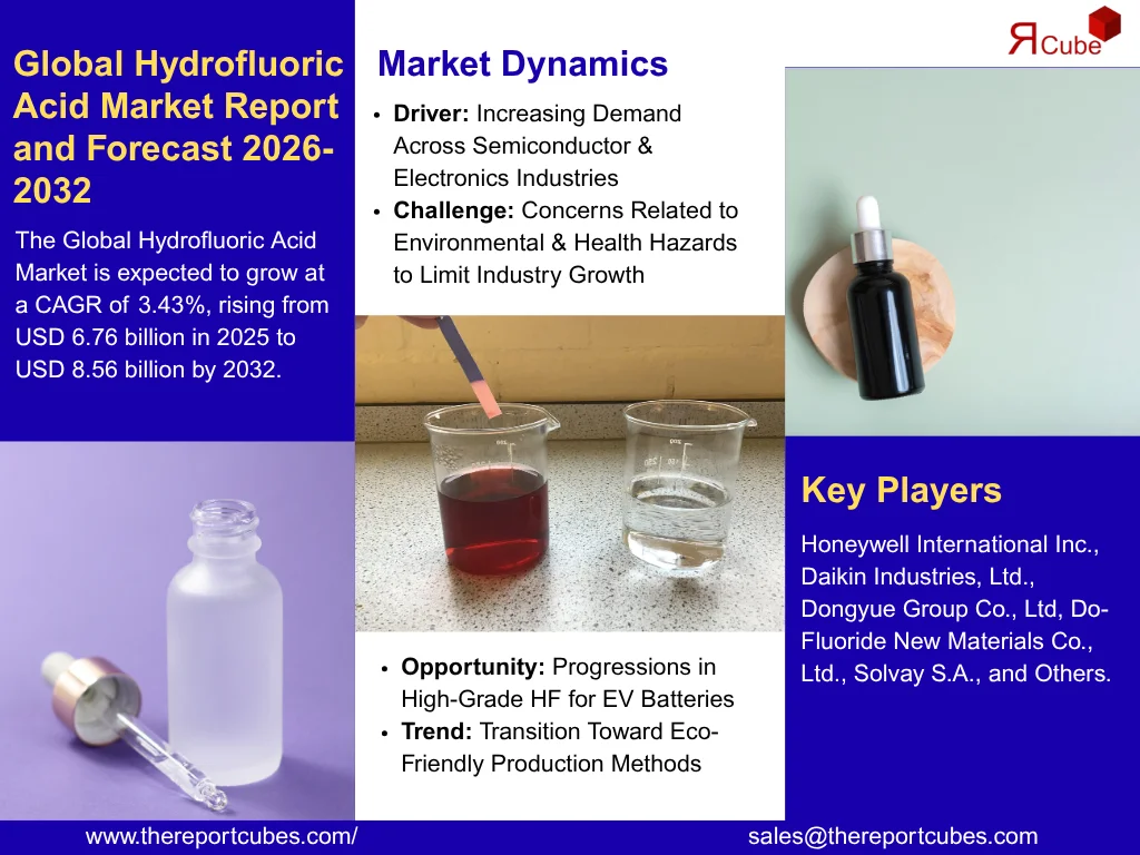 According to the latest report by The Report Cube, study Hydrofluoric Acid Market is anticipated to register a CAGR of around 3.43% during the forecast period, 2026–32. The hydrofluoric acid market size is valued at nearly USD 6.76 billion in 2025 and is projected to reach approximately USD 8.56 billion by 2032. The industry progression is compelled by its increasing demand in numerous industrial applications like glass etching, oil refining, metal pickling, and the making of fluorinated derivatives. Hydrofluoric acid (HF), derived from hydrogen fluoride, is an extremely reactive & corrosive compound that is broadly used in both anhydrous & diluted forms.