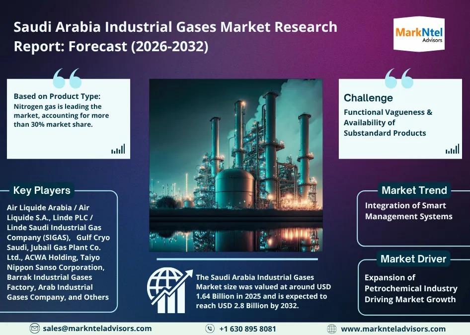 According to MarkNtel Advisors study The Saudi Arabia Industrial Gases Market size was valued at around USD 1.64 Billion in 2025 and is expected to reach USD 2.8 Billion by 2032. Along with this, the market is estimated to grow at a CAGR of around 5.48% during the forecast period, i.e., 2026-32.