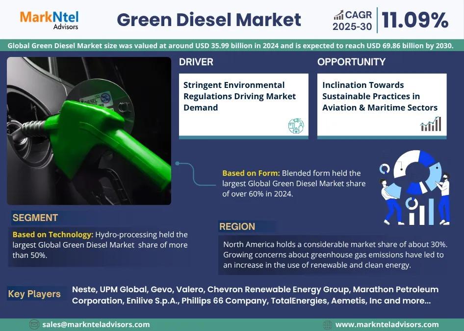According to MarkNtel Advisors study The future of Global Green Diesel Market size was valued at around USD 35.99 billion in 2024 and is expected to reach USD 69.86 billion by 2030. Along with this, the market is estimated to grow at a CAGR of around 11.09% during the forecast period, i.e., 2025-30.