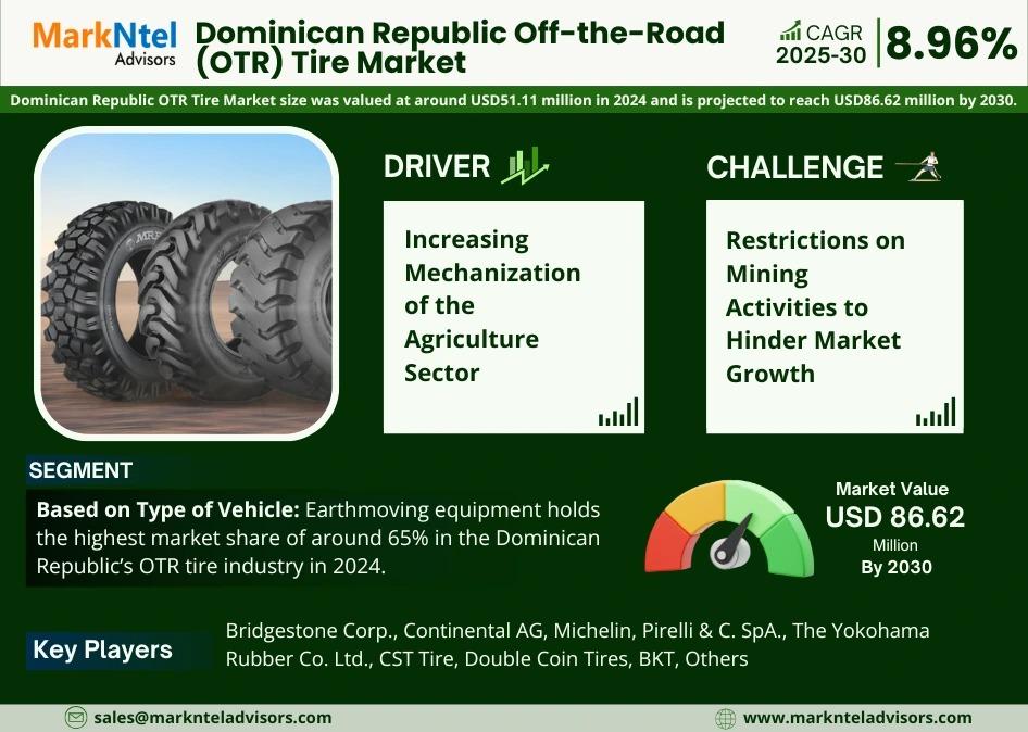 As per recent study by MarkNtel Advisors The Dominican Republic OTR Tire Market size was valued at around USD51.11 million in 2024 and is projected to reach USD86.62 million by 2030. Along with this, the market is estimated to grow at a CAGR of around 8.96% during the forecast period, i.e., 2025-30.