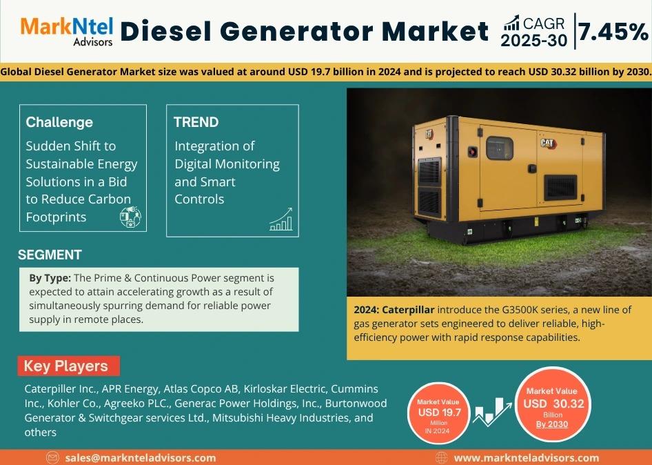 As per recent study by MarkNtel Advisors The Global Diesel Generator Market size was valued at around USD 19.7 billion in 2024 and is projected to reach USD 30.32 billion by 2030. Along with this, the market is estimated to grow at a CAGR of around 7.45% during the forecast period, i.e., 2025-30.