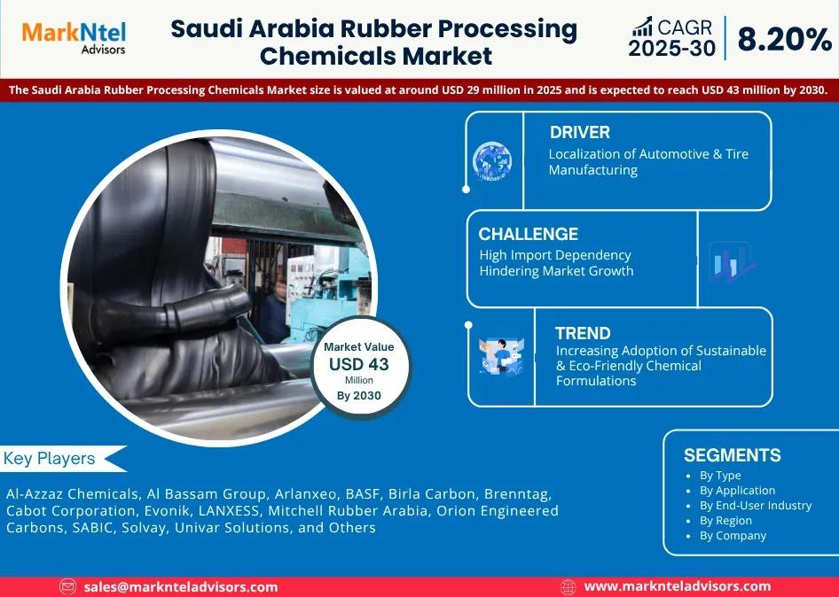 As per recent study by Markntel Advisors The Saudi Arabia Rubber Processing Chemicals Market size is valued at around USD 29 million in 2025 and is expected to reach USD 43 million by 2030. Along with this, the market is estimated to grow at a CAGR of around 8.20% during the forecast period, i.e., 2025-30.