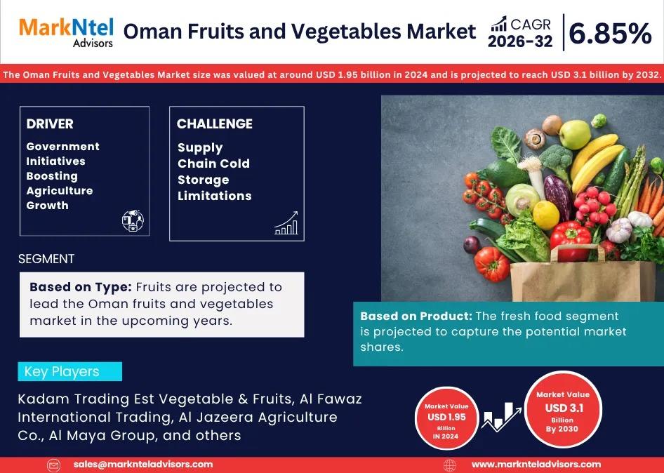 According to MarkNtel Advisors study The future of Oman Fruits and Vegetables Market size was valued at around USD 1.95 billion in 2024 and is projected to reach USD 3.1 billion by 2032. Along with this, the market is estimated to grow at a CAGR of around 6.85% during the forecast period, i.e., 2026-32.