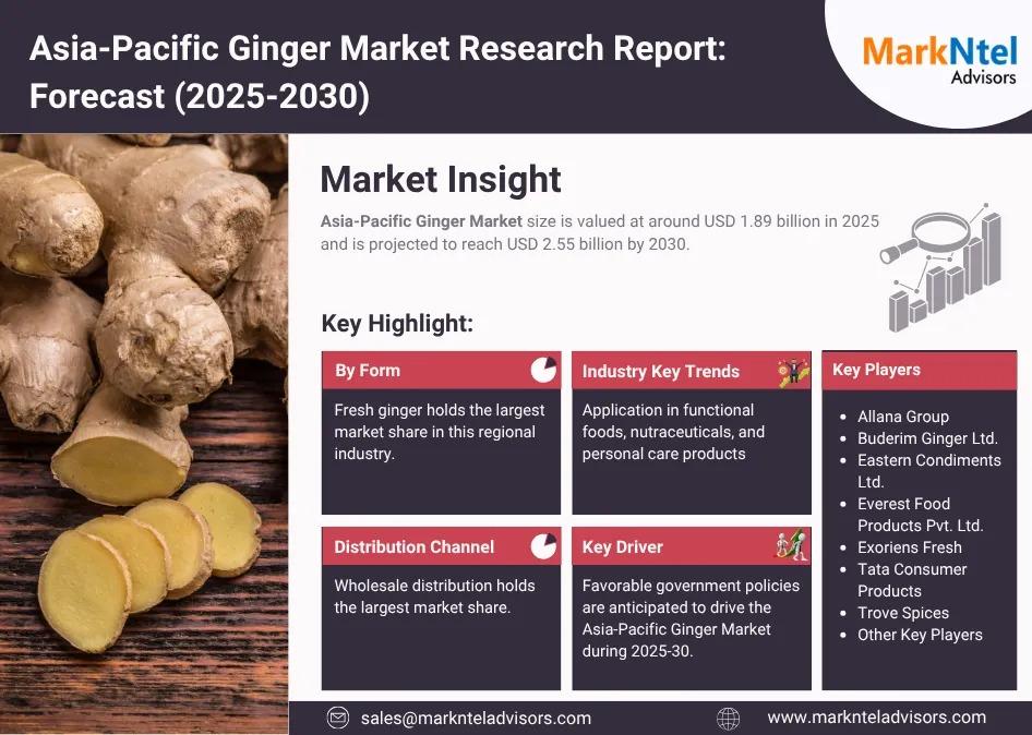 According to MarkNtel Advisors study The future of Asia-Pacific Ginger Market size is valued at around USD 1.89 billion in 2025 and is projected to reach USD 2.55 billion by 2030. Along with this, the market is estimated to grow at a CAGR of around 6.17% during the forecast period, i.e., 2025-30.