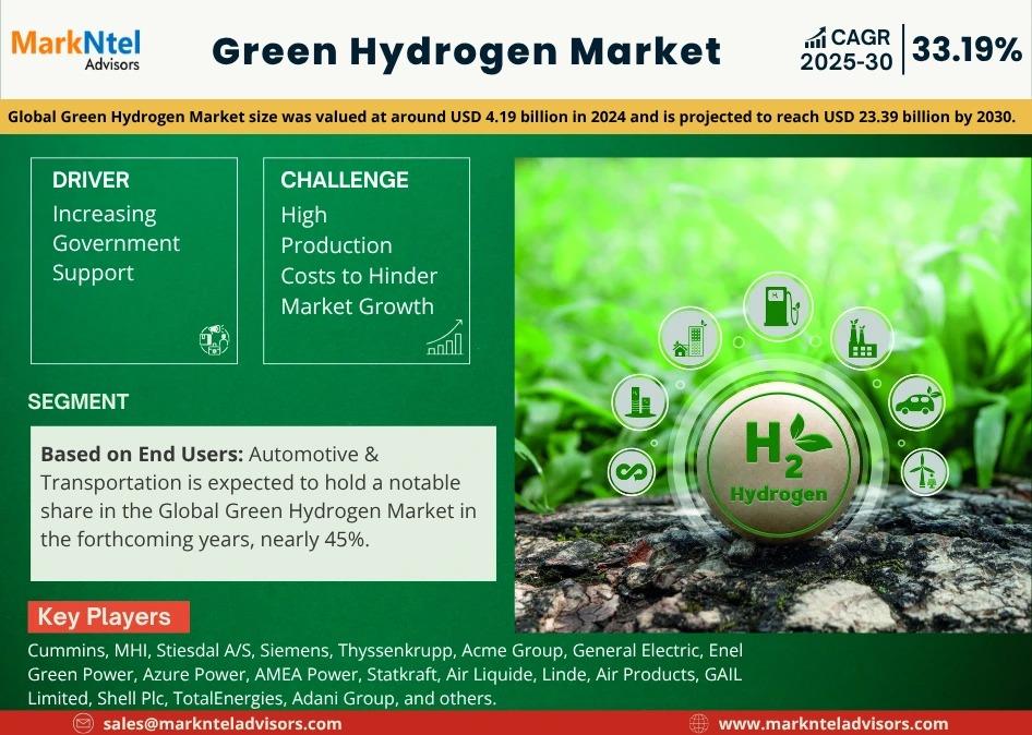 As per recent study by Markntel Advisors The Global Green Hydrogen Market size was valued at around USD 4.19 billion in 2024 and is projected to reach USD 23.39 billion by 2030. Along with this, the market is estimated to grow at a CAGR of around 33.19% during the forecast period, i.e., 2025-30.