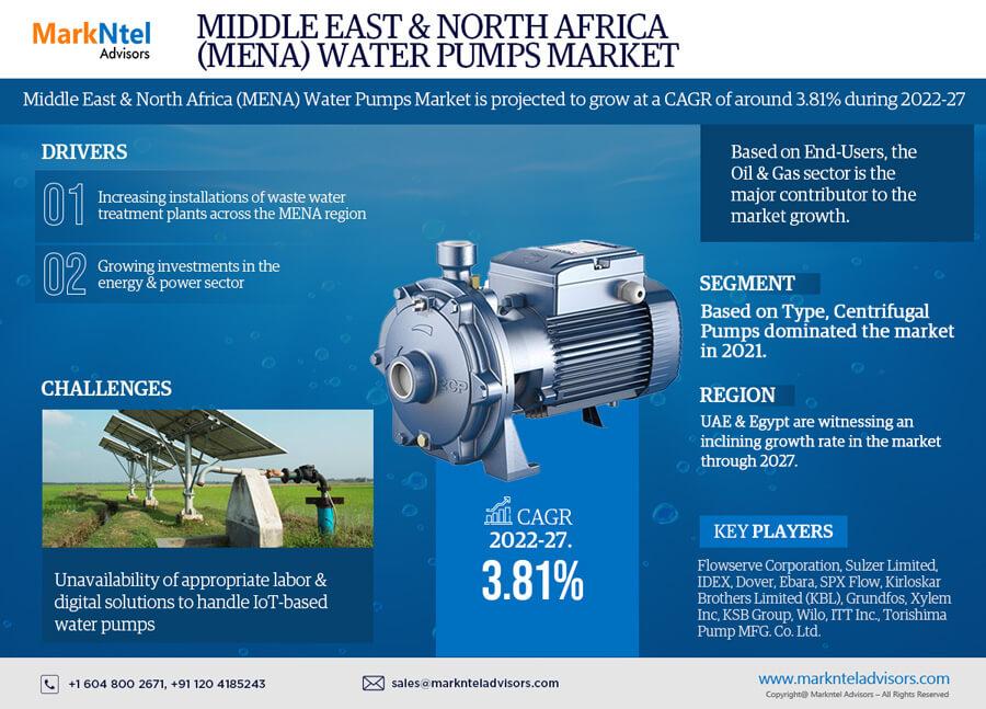 As per recent study by Markntel Advisors The Middle East & North Africa (MENA) Water Pumps Market is projected to grow at a CAGR of around 3.81% during the forecast period, i.e., 2022-27, says MarkNtel Advisors.