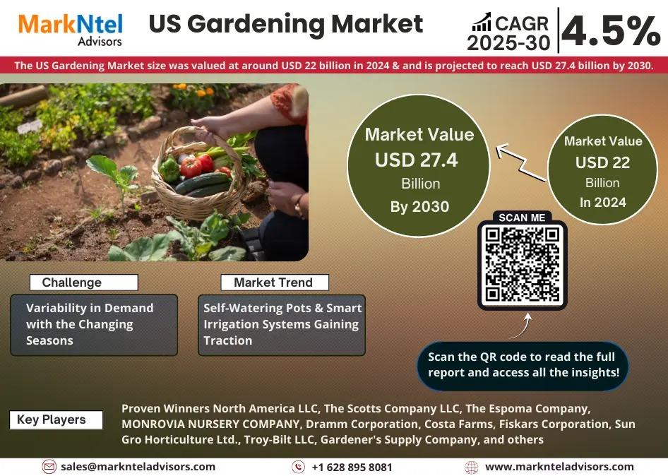 As per recent study by Markntel Advisors The US Gardening Market size was valued at around USD 22 billion in 2024 & and is projected to reach USD 27.4 billion by 2030. Along with this, the market is estimated to grow at a CAGR of around 4.5% during the forecast period (2025-30).