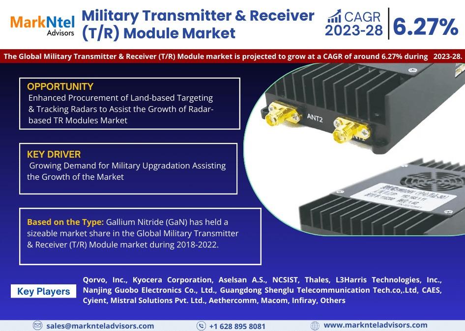 MarkNtel Advisors, a leading market research and consulting firm, has announced the release of its latest study titled Military Transmitter & Receiver (T/R) Module Market Research Report: Forecast (2023-2028). This report provides a detailed assessment of the Military Transmitter & Receiver (T/R) Module Market, covering its evolving dynamics, emerging trends, key growth drivers, major challenges, and competitive landscape.
