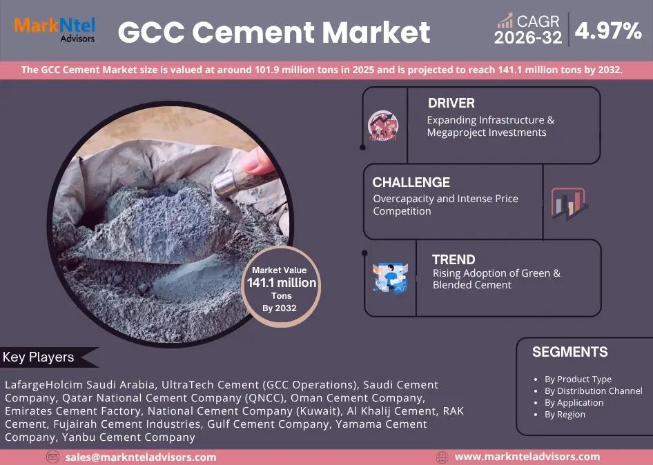 MarkNtel Advisors, a leading market research and consulting firm, has announced the release of its latest study titled GCC Cement Market Research Report: Forecast (2026-2032). This report provides a detailed assessment of the GCC Cement Market, covering its evolving dynamics, emerging trends, key growth drivers, major challenges, and competitive landscape.
