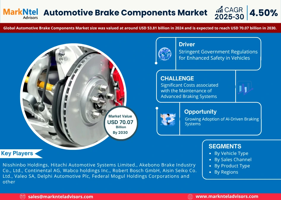 MarkNtel Advisors Releases Comprehensive Study on the Global Automotive Brake Components Market, Forecasting Strong Growth from 2025-2030