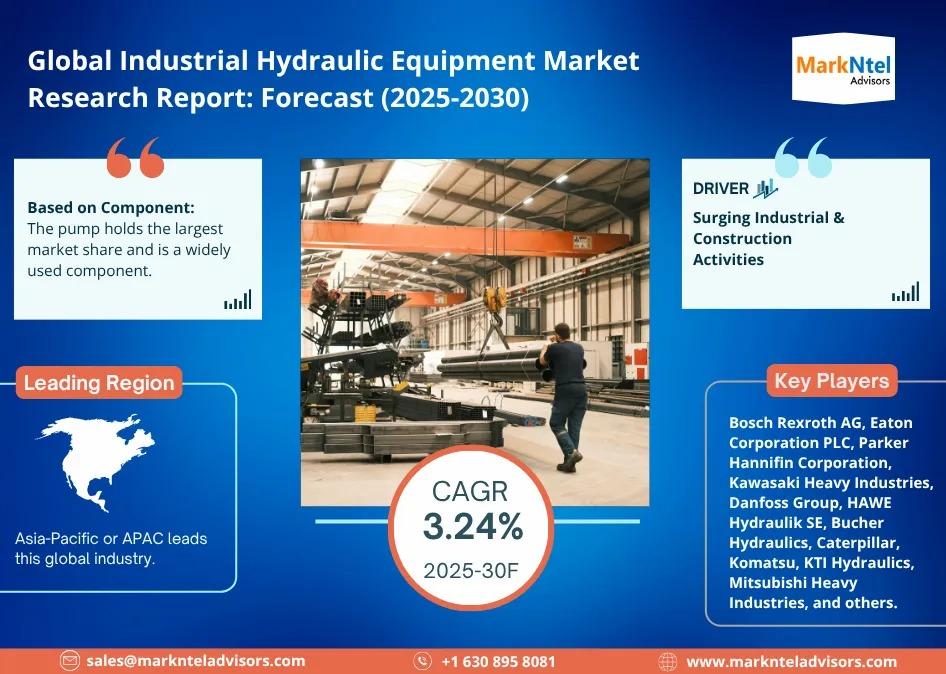 As per recent study by MarkNtel Advisors The Global Industrial Hydraulic Equipment Market size was valued at around USD 39.4 billion in 2024 and is projected to reach USD 47.71 billion by 2030. Along with this, the market is projected to grow at a CAGR rate of around 3.24% during the forecast period, 2025-30.