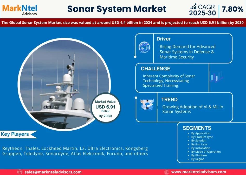 As per recent study by MarkNtel Advisors The Global Sonar System Market size was valued at around USD 4.4 billion in 2024 and is projected to reach USD 6.91 billion by 2030. Along with this, the market is estimated to grow at a CAGR of around 7.80% during the forecast period, i.e., 2025-30.