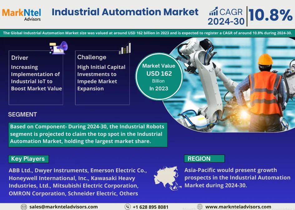 The Global Industrial Automation Market size was valued at around USD 162 billion in 2023 and is expected to register a CAGR of around 10.8% during the forecast period, i.e., 2025-30. According to MarkNtel Advisors Study.