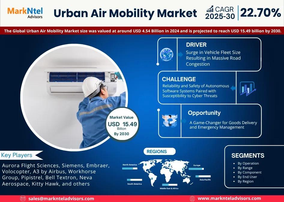 The Global Urban Air Mobility Market size was valued at around USD 4.54 Billion in 2024 and is projected to reach USD 15.49 billion by 2030. Along with this, the market is estimated to grow at a CAGR of around 22.70% during the forecast period, i.e., 2025-30. According to MarkNtel Advisors Study.