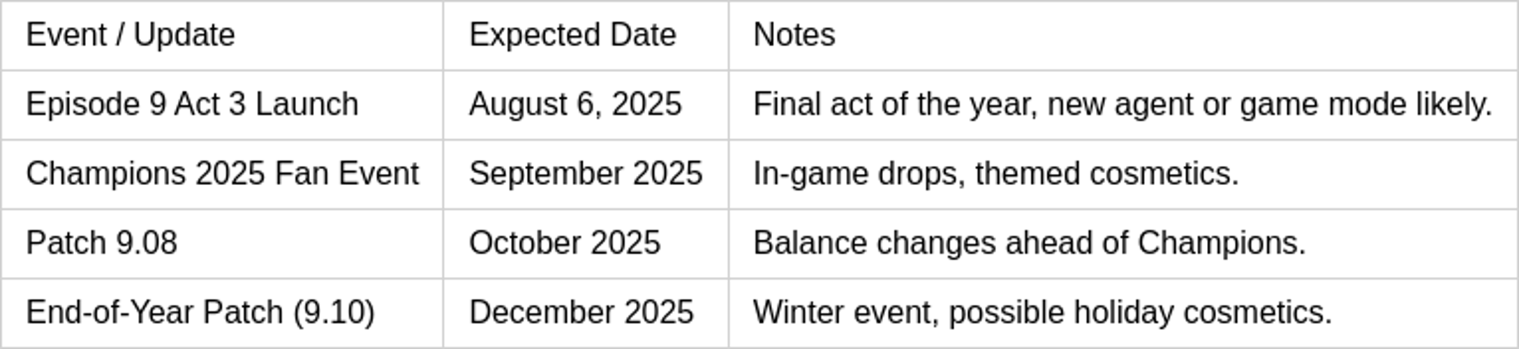 L’acte 3, prévu pour début août, est déjà en préparation avec des teasing de nouveaux agents ou cartes, ainsi que la rotation du passe de bataille et la préparation pour les championnats VCT. En dehors de ces mises à jour, la fin d’année 2025 s’annonce riche en événements liés à l’e-sport, aux promotions de fin d’année et aux phases clés du calendrier Valorant, maintes fois attendues par la communauté.