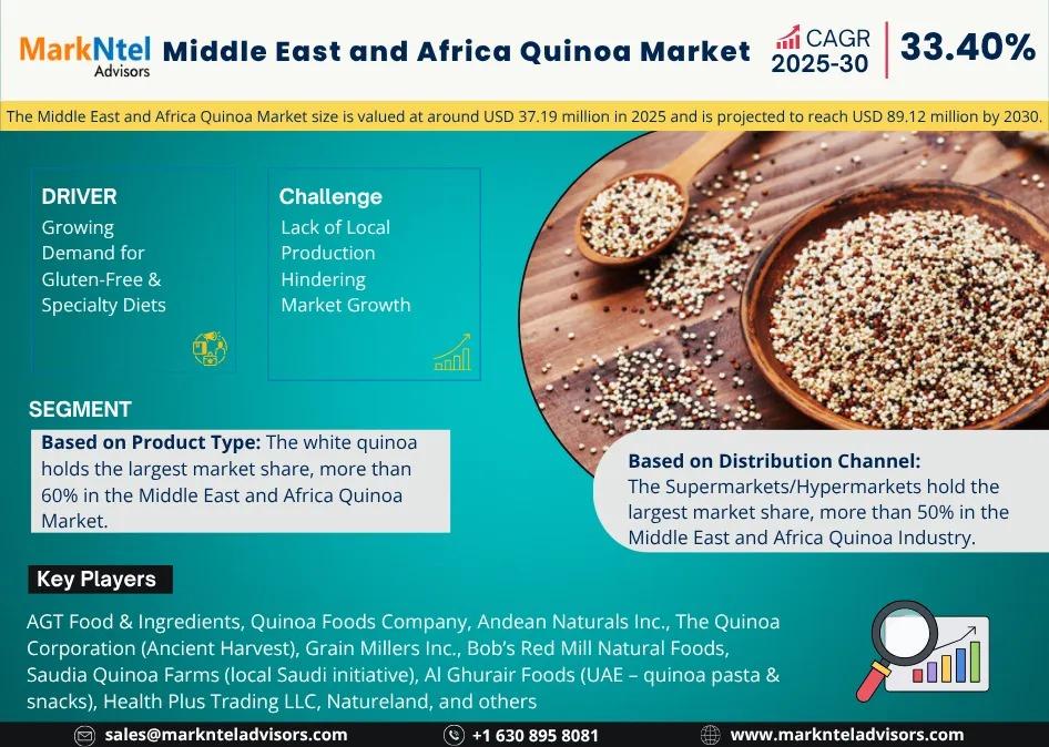 According to MarkNtel Advisors study The future of Middle East and Africa Quinoa Market size is valued at around USD 37.19 million in 2025 and is projected to reach USD 89.12 million by 2030. Along with this, the market is estimated to grow at a CAGR of around 19.10% during the forecast period, i.e., 2025-30.