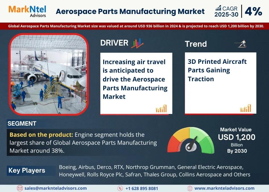 As per recent study by Markntel Advisors The Global Aerospace Parts Manufacturing Market size was valued at around USD 936 billion in 2024 and is projected to reach USD 1,200 billion by 2030. Along with this, the market is estimated to grow at a CAGR of around 4% during the forecast period, i.e., 2025-30.