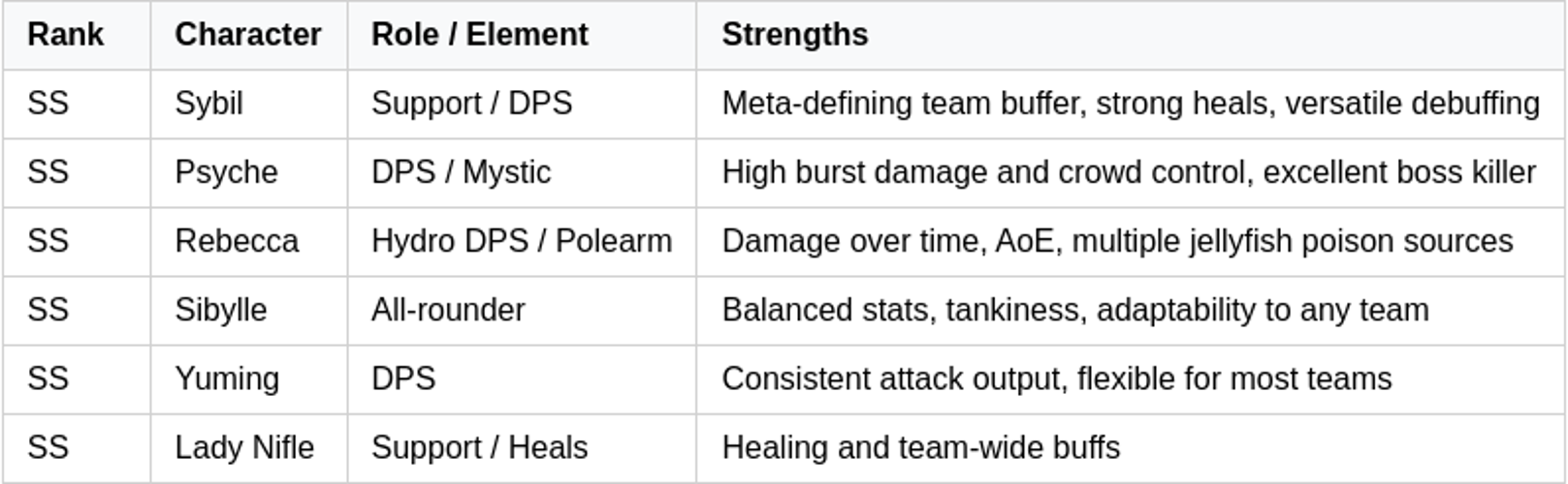 Sybil serves as an essential team buffer and healer, proving indispensable during prolonged battles and difficult content challenges.