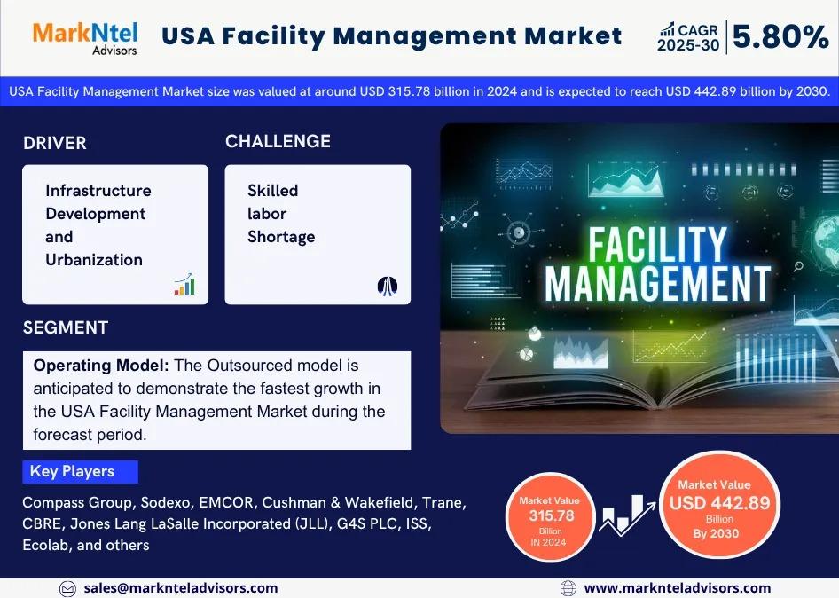 As per recent study by Markntel Advisors The USA Facility Management Market size was valued at around USD 315.78 billion in 2024 and is expected to reach USD 442.89 billion by 2030. Along with this, the market is estimated to grow at a CAGR of around 5.80% during the forecast period, i.e., 2025-30.