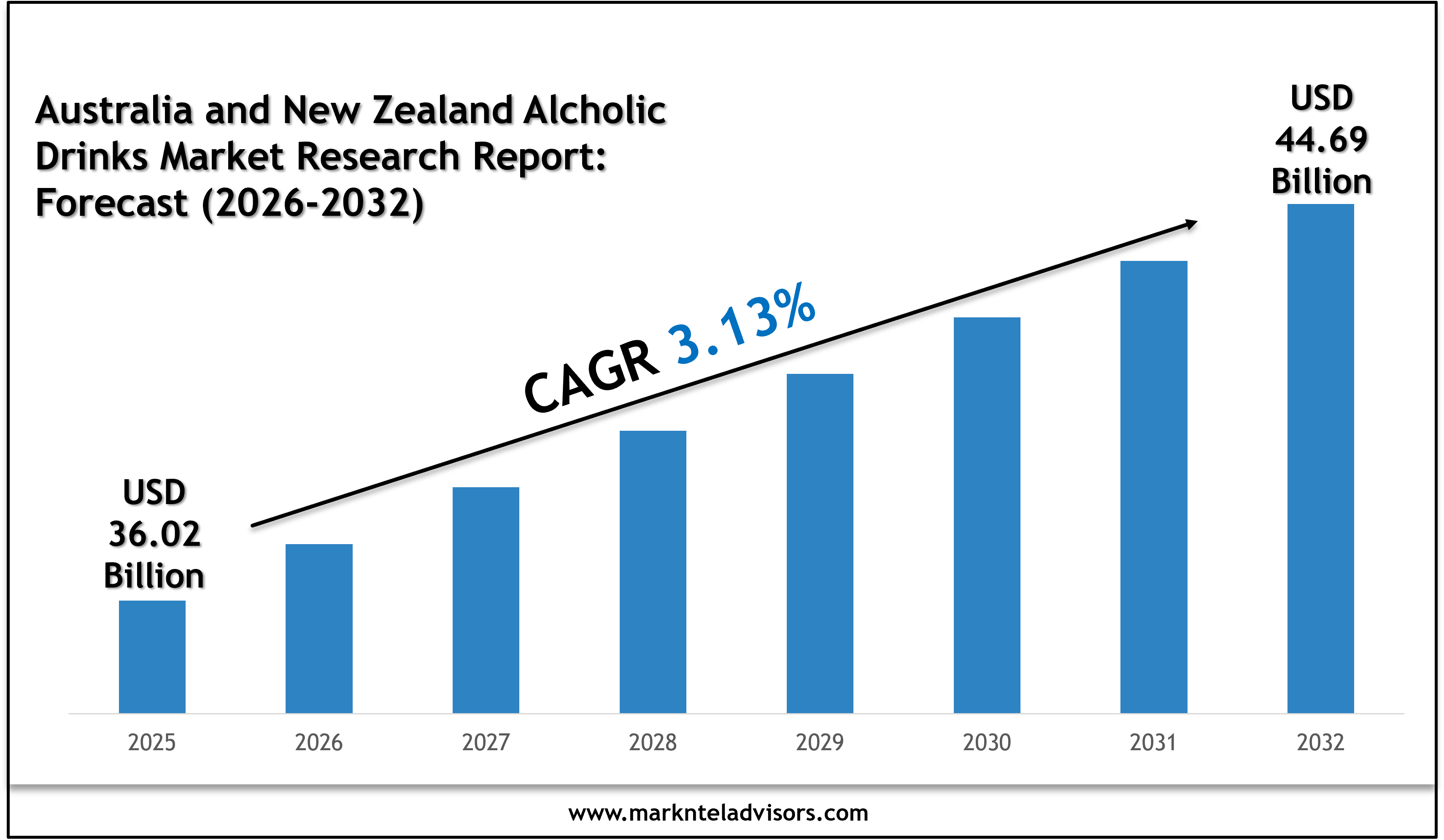 The Australia & New Zealand Alcoholic Drinks Market size is valued at around USD 36,022.09 million in 2025 and is projected to reach USD 44,695.52 million by 2032. Along with this, the market is estimated to grow at a CAGR of around 3.13% during the forecast period, i.e., 2026-32.
